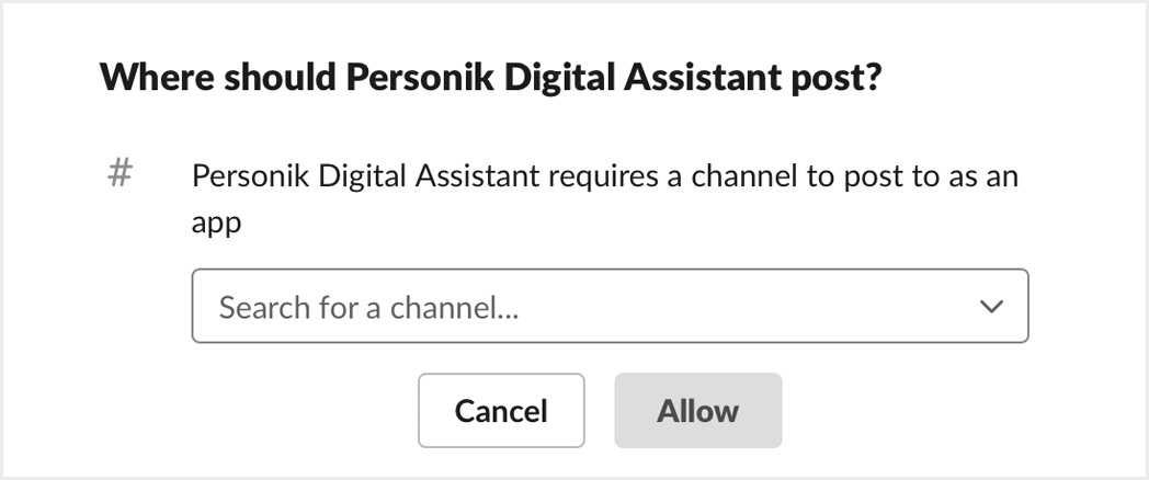 In the bottom block «Where should Personik Digital Assistant post?» choose yourself as a recipient of posts. Press «Allow»-button then.